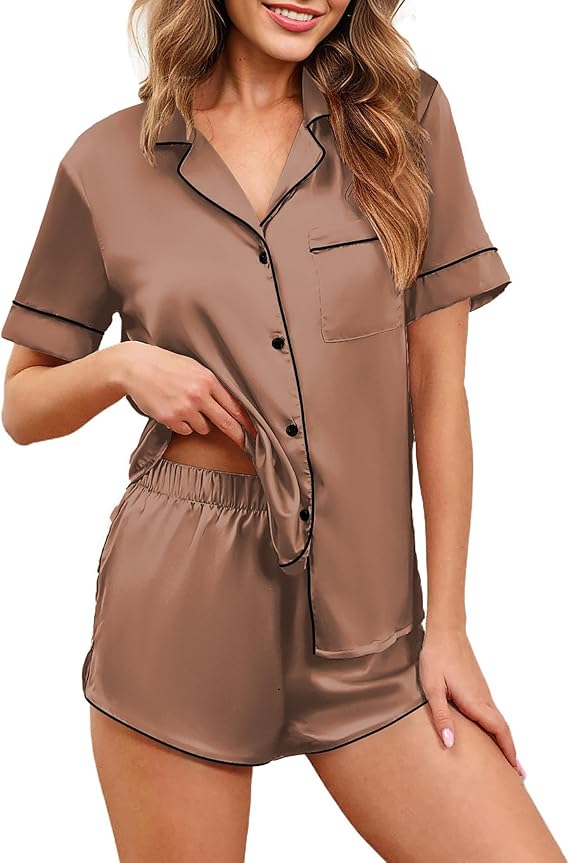 Womens Silk Satin Pajamas Set Short Sleeve Sleepwear Button Down Loungewear 2 Piece Pjs Shorts Set S-XXL