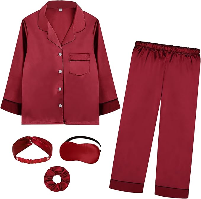Satin Kid Short Pajamas Set 5 Piece Child Silk Pjs Button Sleepwear with Eye Mask, Hairhand, Hair Ring
