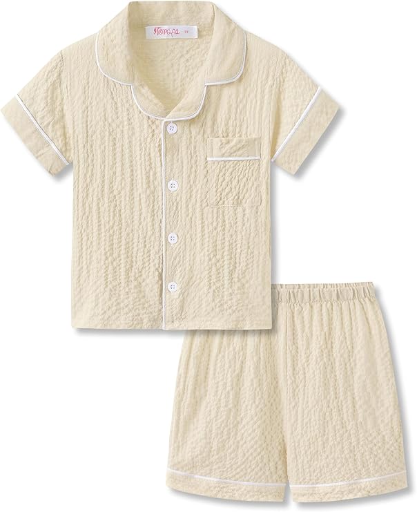 Toddler Button-Down Textured Crinkle Style Pajamas for Unisex Kids Apricot 2PC Set Short Sleeve PJS Size 2T-5T