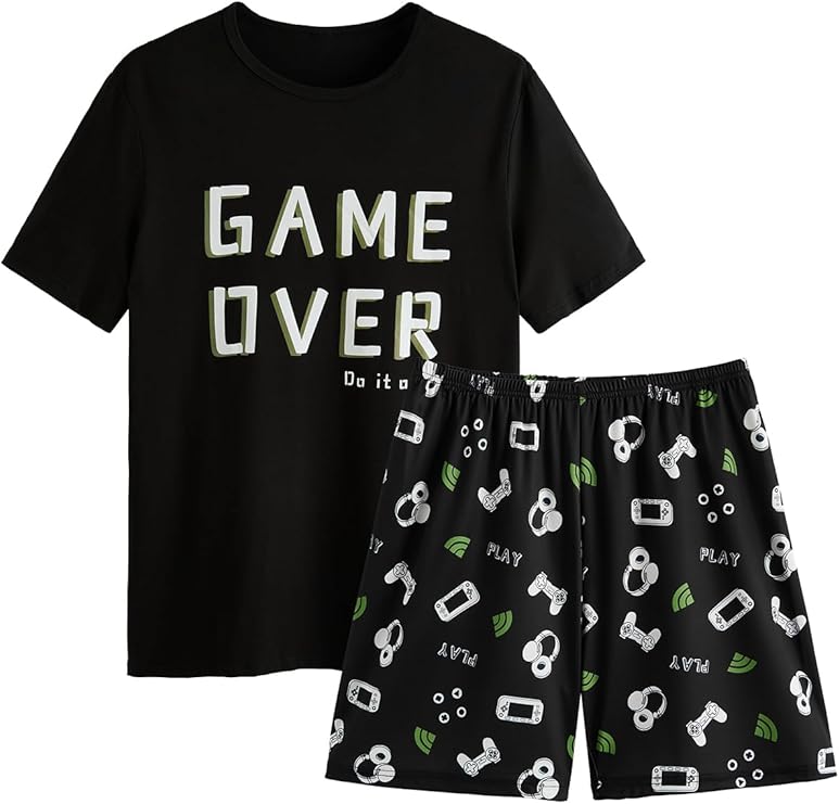 Men's 2 Piece PJ Sets Pajama Shorts Sets Short Sleeve Letter Print Tee and Short Lounge Set