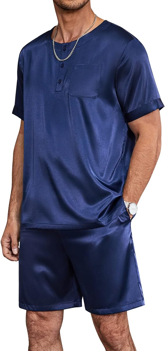 Men Satin Pajamas Set 2 Piece Silk Sleepwear Shorts Button Down Tops Loungewear with Pockets
