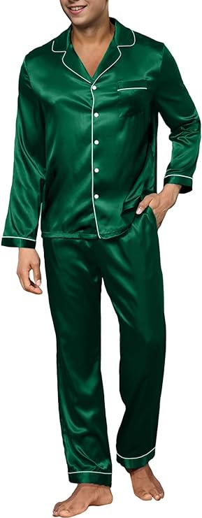 Men's Silk Pajama Set Button Down Long Sleeve Shirts and Pants 2 Piece Matching Pjs Set with Pockets