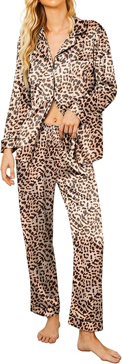 Womens Silk Satin Pajamas Set Button Down 2 Piece Pjs Short Sleeve Long Pants Sleepwear Lounge Set, S-XXL