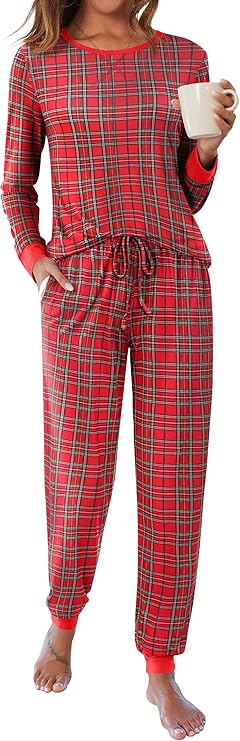 Womens 2 Piece Pajama Set Long Sleeve PJs with Plaid Pants Drawstring Elastic Waist Sleepwear Lounge Set