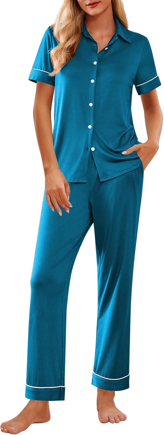 Women 2 Piece Pajamas Set Button Down Short Sleeve Pjs Set Soft Lounge Set with Long Pants S-XXL